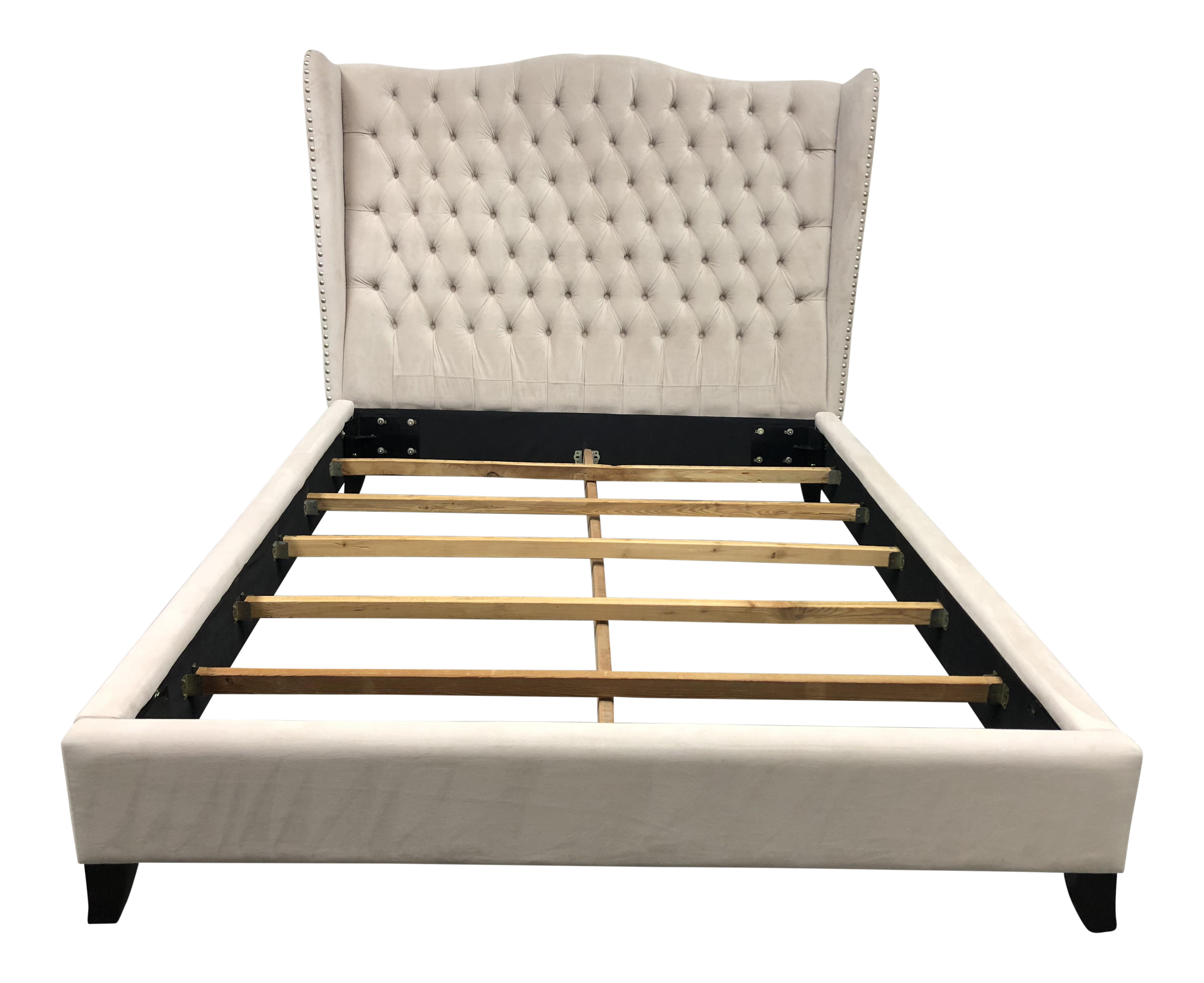 The jameson bed takes classic design elements like button tufting a nailhead trim and the ornate shape adds to its glamour.